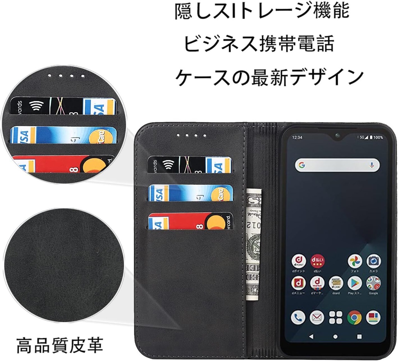 【カードポケット付き】:財布型ケースとして、名刺やお札などを入れるカードポケットがつき、ちょっとしたお出かけにもスマホケース一つでOK!日常生活に便利です。ただし、カードを入れ過ぎると、閉まらない場合がありますので、ご遠慮ください。