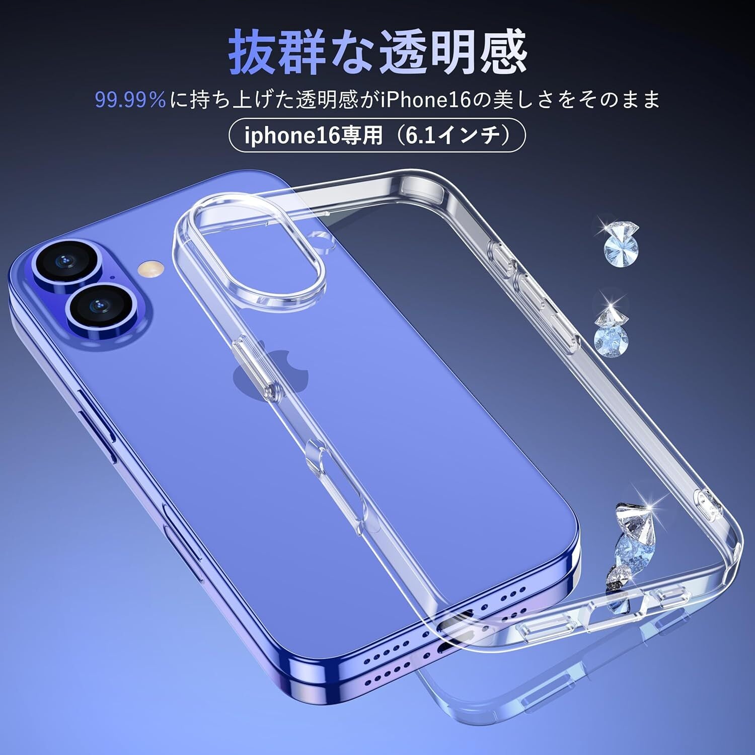 【高い透明度・黄変に強い】高解像度素材を用いた超高透明度のクリアケースは、いPhone16のリアルな色と高級感を鮮明に表現し、本来の美しさを楽しむことができます。また、最新の黄変防止技術を採用することで、ケースを長時間使用しても鮮明で透明性を保ち、日常使用時の指紋や油汚れなどによる損失を軽減することができます。
