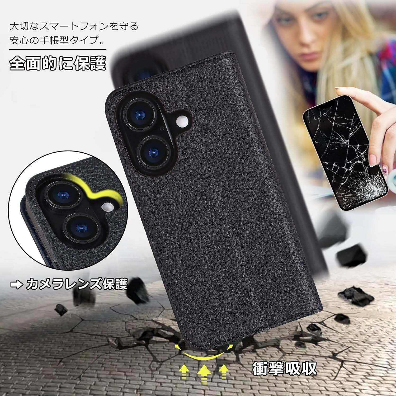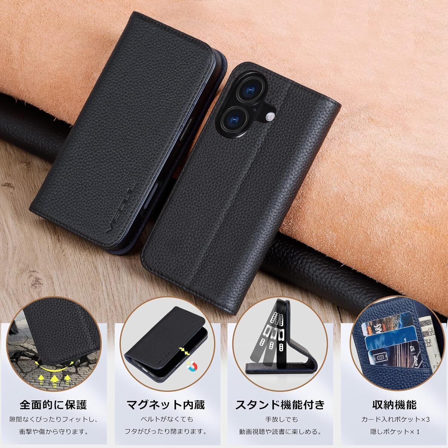 【iPhone16対応、本革素材手帳型ケース】背面だけでなく、画面を覆っているため、画面から直接地面に落ちる場合は、スマホの画面を保護してくれるので安心といったイメージがあります。カバーの面積が広くなり、カバーの外側や内側を有効利用できる点も手帳型の魅力の1つでしょう。定期やクレジットカードといったものは、生活する上で頻繁に使いますよね。実用的な設計で、ケース装着時でも、カメラ、電源ボタン、音量ボタン、イヤホンジャック等に支障なく使用可能となります。放熱性が良くて、傷や埃を防ぐことができます。シンプルなデザインで全面保護するアイホン16対応の手帳型タイプで大切なスマホを衝撃や傷から守ってくれます。