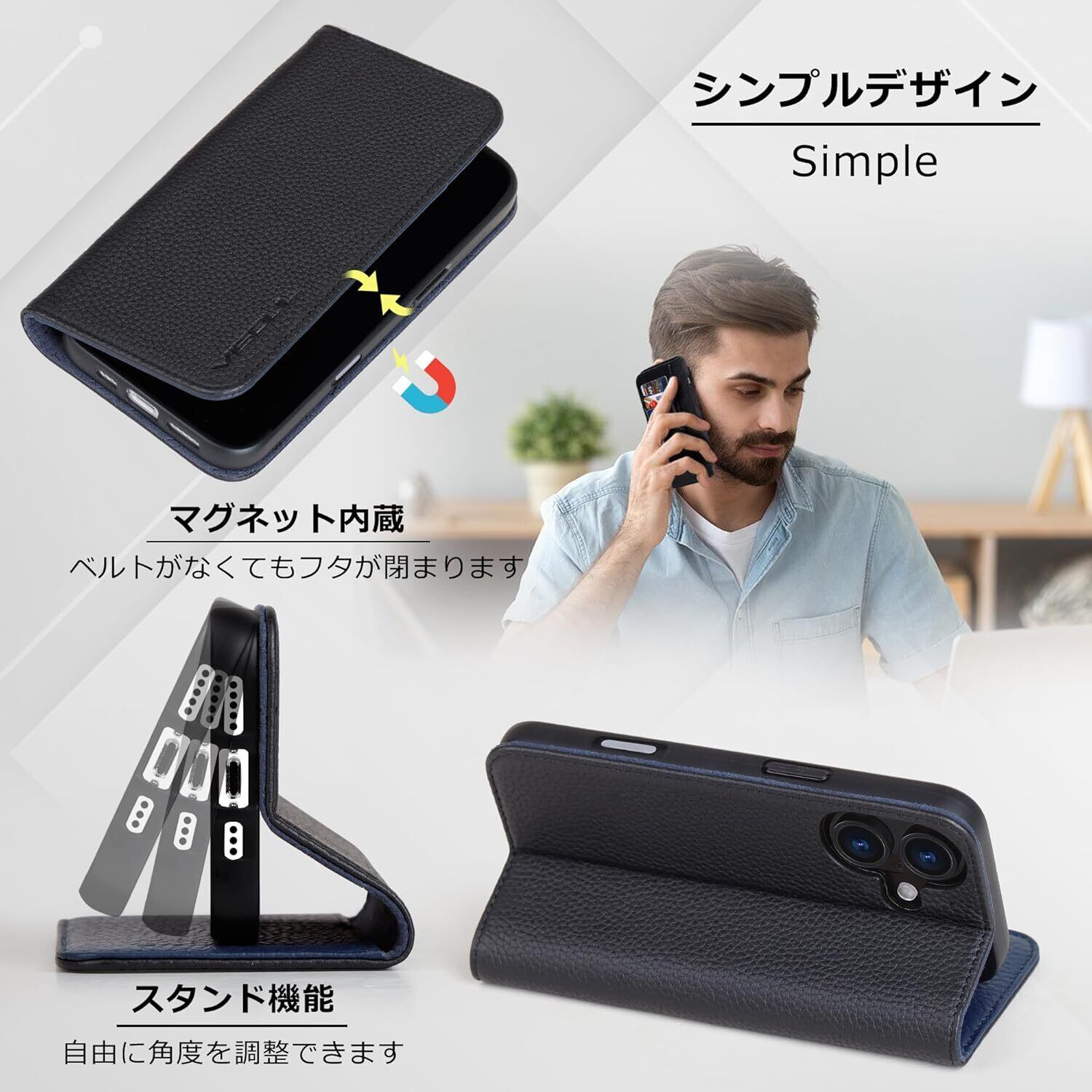 【収納ポケット、横置きスタンド機能】アイホン16 対応実用性のカード入れポケット×3、カード類、ポイントカードなどを収納できます。内側隠しポケット×1、更にお札、小銭も収納できるポケットも装備しますので、通勤も通学にも楽々タイプです。「横置きスタンド機能」が付きまして、好きな角度を調節できて、手放しでも動画視聴や読書に楽しめる。★マグネットが内蔵されているので、ベルトがなくてもフタがぴったり閉まります。